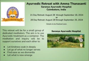 This retreat will be for a small group of meditation practitioners undergoing Ayurvedic treatment. We will meet 1-2 times a day for guided meditation, discussion, and inquiry. This will not be a silent retreat. Amma will also be undergoing treatment.